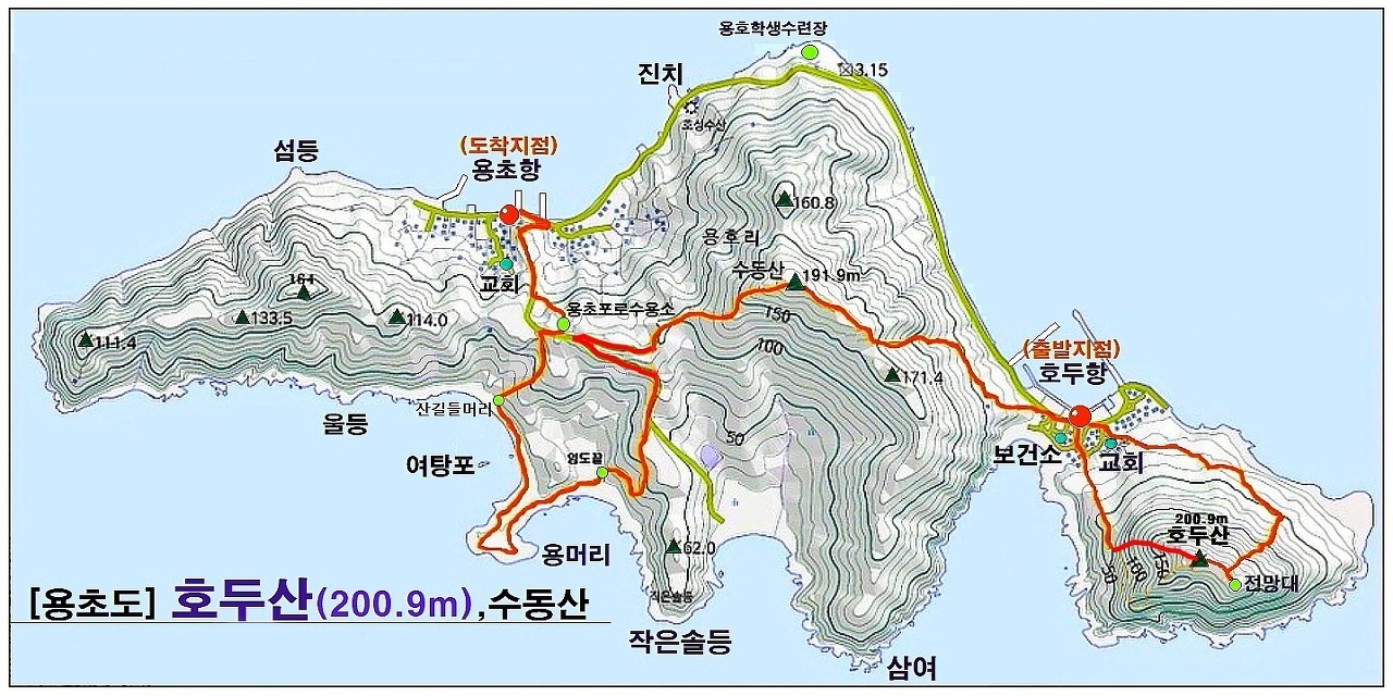 나무보다 풀 많다고 용초마을 이름 되고 황금바위 몽돌들이 해변을 지켜내고 호두마을 너른 바위 편히 누워 쉬고픈 곳, 하지만 곳곳에선 포로수용 유적들이 산행하는 우리들께 좌우이념 일깨운다